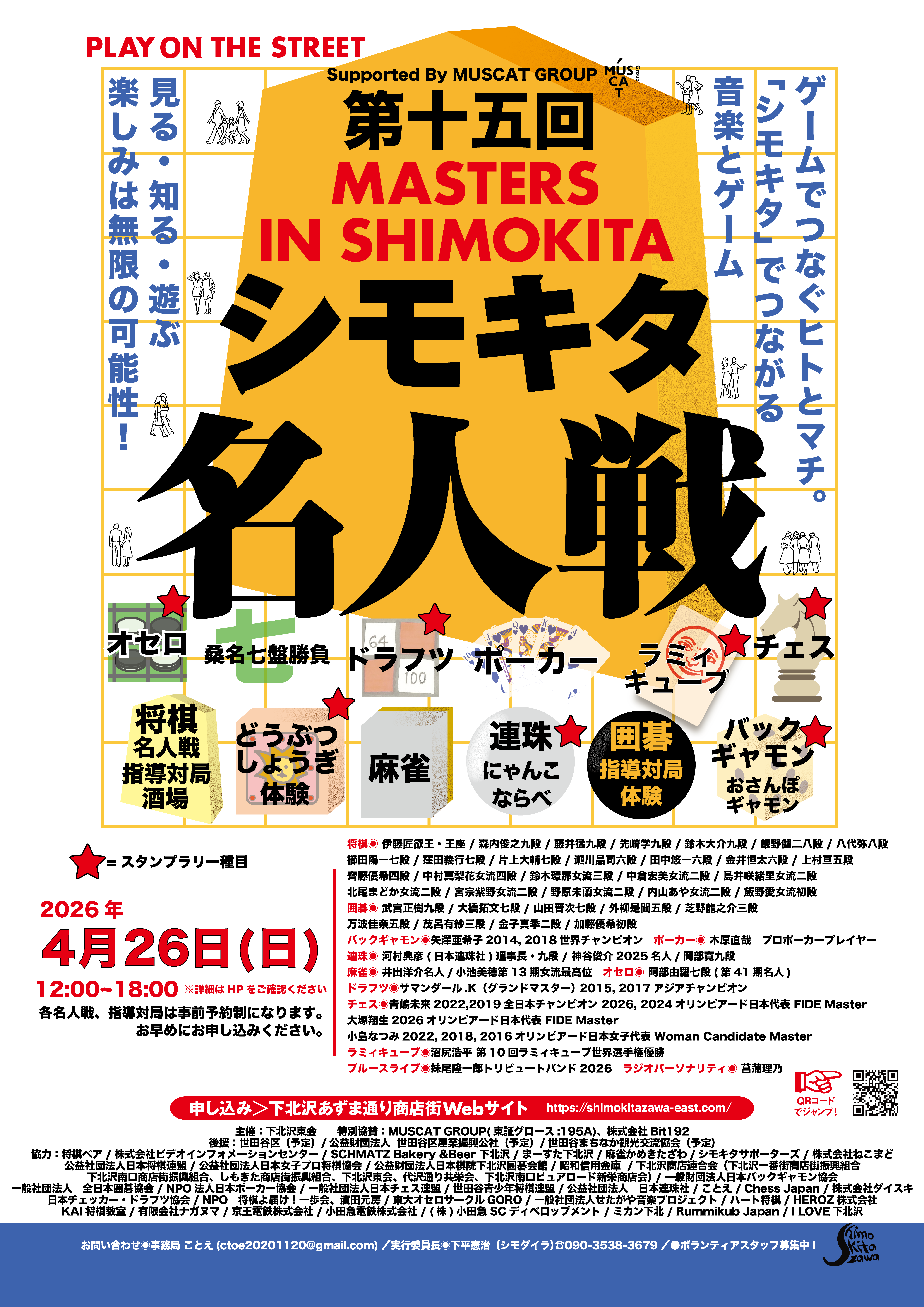 指定のお時間(後日発表)までにシモキタ名人戦の受付にて参加費500円をお支払いの上、専用のQRコードよりご参加ください。