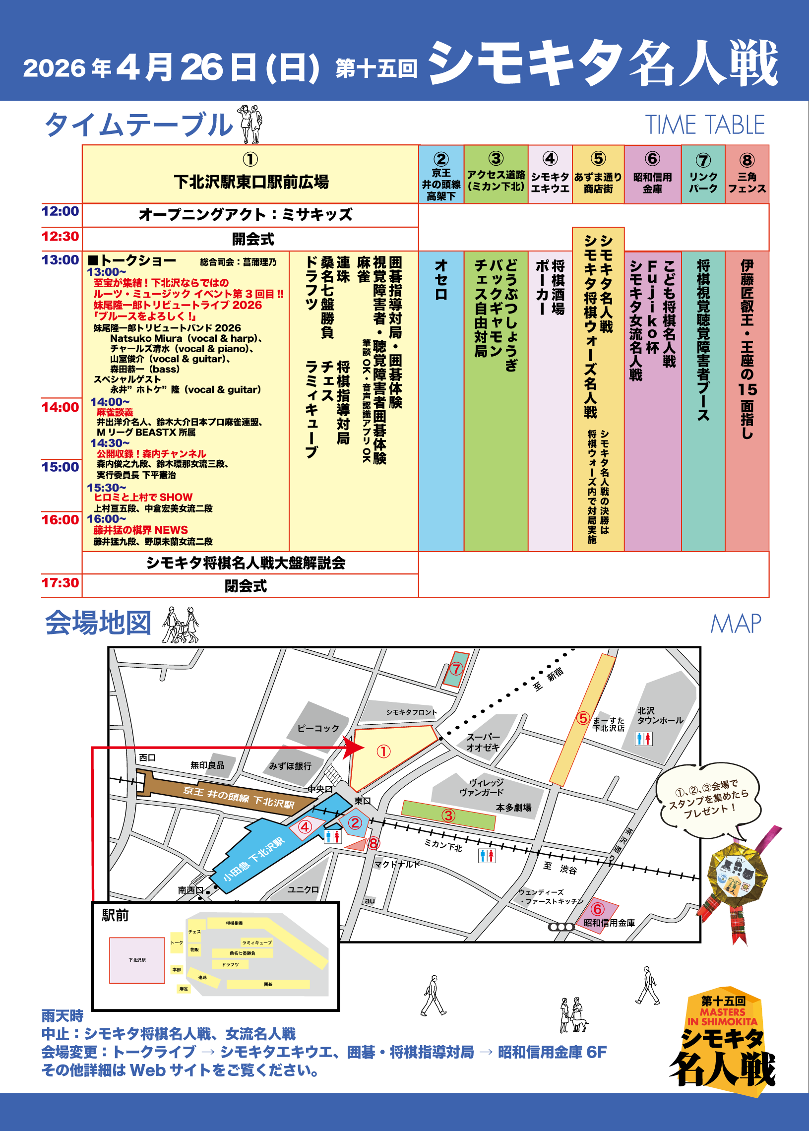 将棋ベア、株式会社ビデオインフォメーションセンター、SCHMATZ Bakery &Beer 下北沢、まーすた下北沢、麻雀かめきたざわ、シモキタサポーターズ、公益社団法人日本将棋連盟、株式会社ねこまど、公益社団法人日本女子プロ将棋協会、公益財団法人日本棋院下北沢囲碁会館、昭和信用金庫、下北沢商店連合会(下北沢一番街商店街振興組合、下北沢南口商店街振興組合、しもきた商店街振興組合、下北沢東会、代沢通り共栄会、下北沢南口ピュアロード新栄商店会)、一般財団法人バックギャモン協会、一般社団法人全日本囲碁協会、NPO法人日本ポーカー協会、一般社団法人日本チェス連盟、世田谷青少年将棋連盟、公益社団法人 日本連珠社、ことえ、ChessJapan、日本チェッカー・ドラフツ協会、NPO 将棋よ届け!一歩会、有限会社ナガヌマ、東大オセロサークルGORO、一般社団法人せたがや音楽プロジェクト、京王電鉄株式会社、小田急電鉄株式会社、(株)小田急 SCディベロップメント、ミカン下北、Ruumikub Japan、I LOVE下北沢、HEROZ株式会社 |